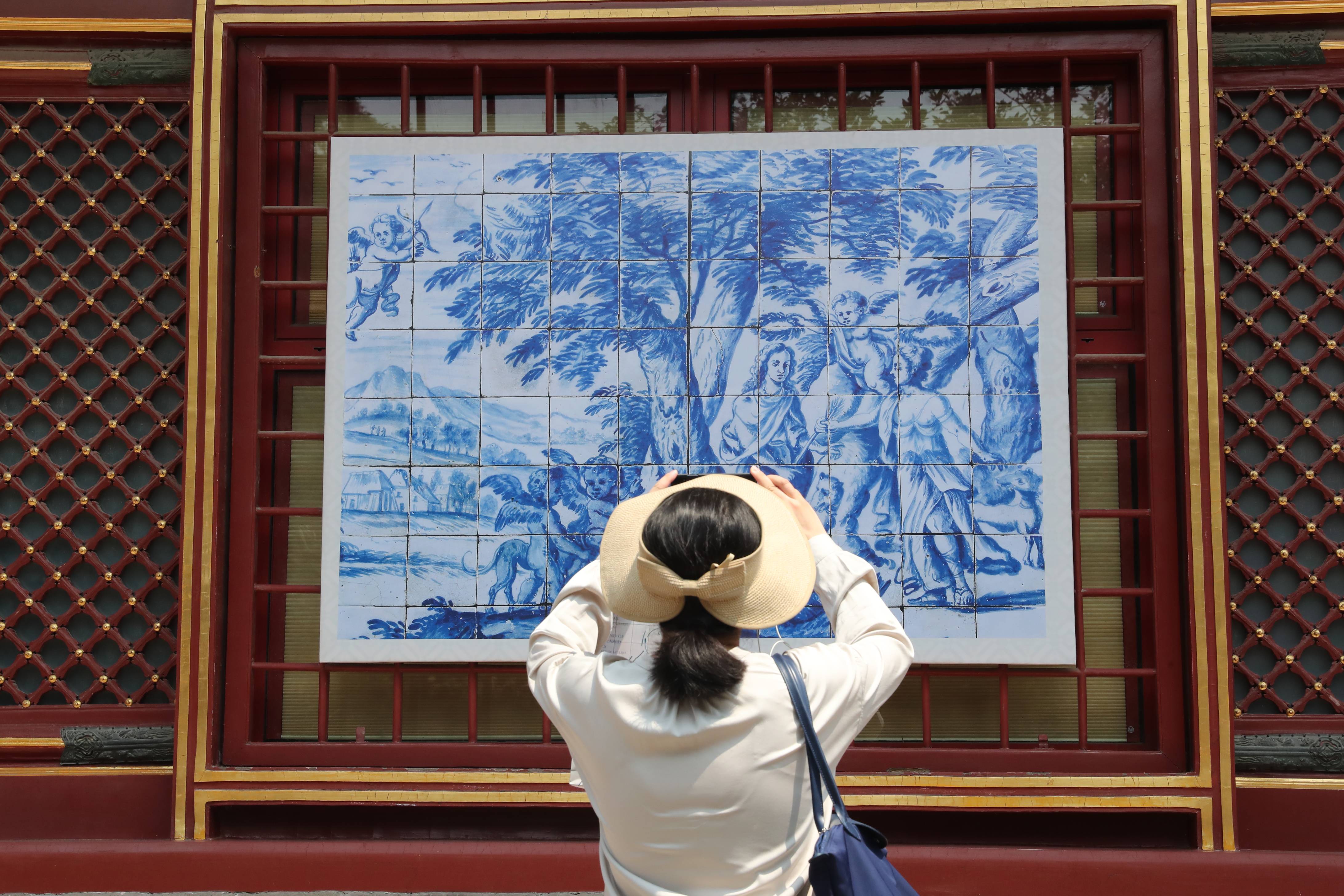 A visitor takes a photo of a piece of Portuguese azulejo in the Palace Museum on June 11, 2019. (Xinhua)