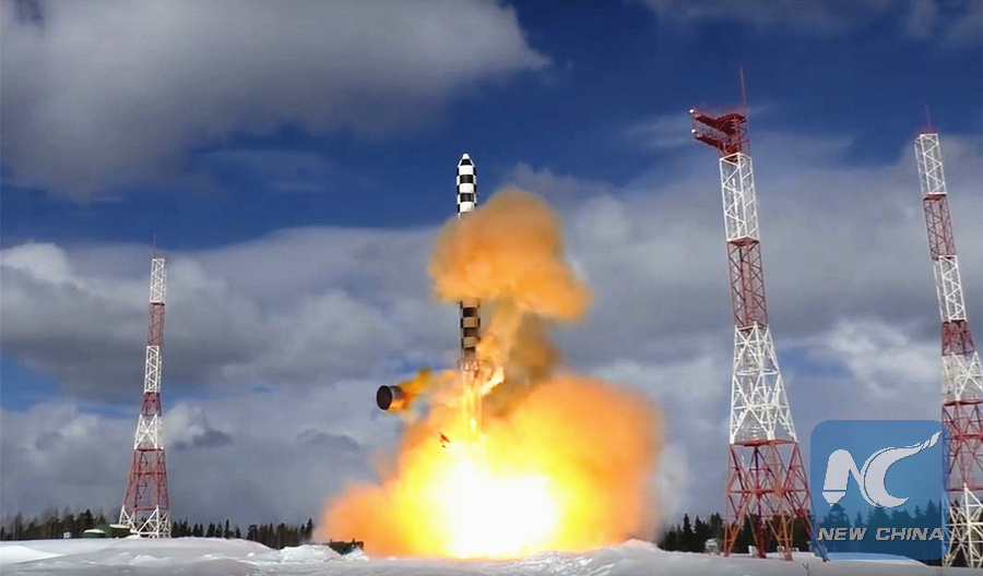 In this image from video provided by the Russian Defense Ministry, the Sarmat intercontinental ballistic missile blasts off during a test launch from the Plesetsk launch pad in northwestern Russia, March 30, 2018.