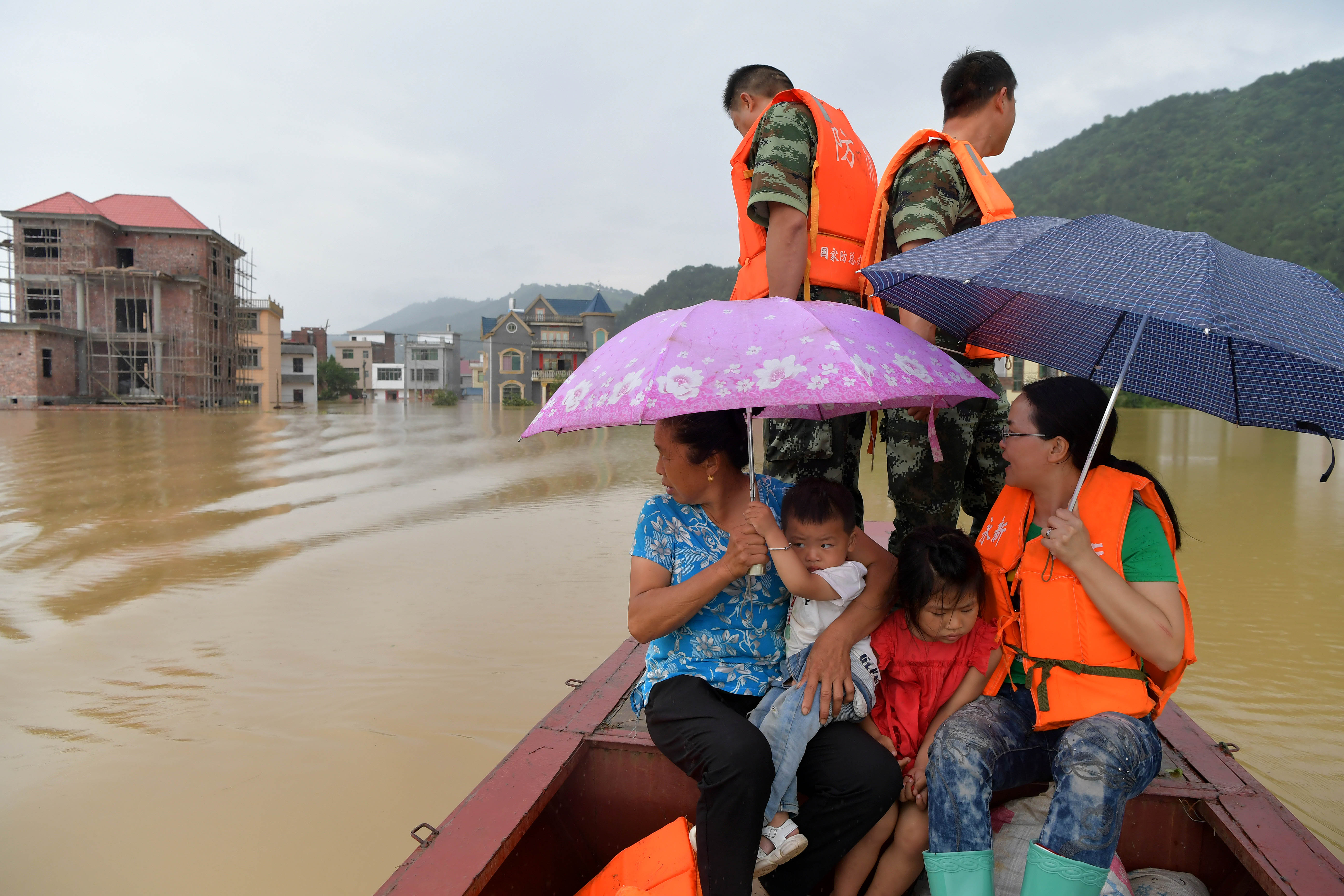 Rescuers transfer stranded villagers at the flooded Paixing Village of Zaizhong Township in Yongxin County, east China's Jiangxi Province, June 9, 2019. (Xinhua)