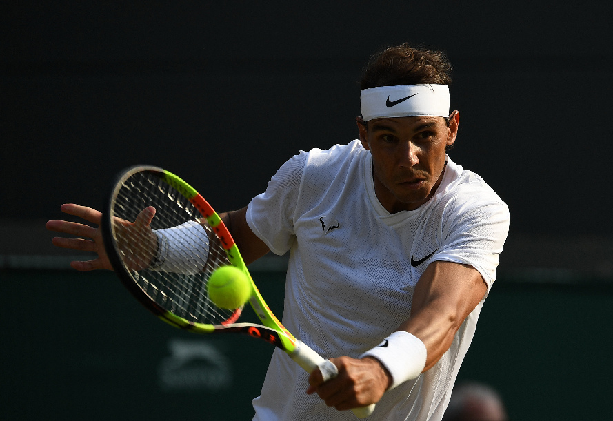 Rafael Nadal returns the ball during the men's singles quarterfinal match against Sam Querrey of the United States at the 2019 Wimbledon Tennis Championships in London, Britain, on July 10, 2019. (Xinhua/Lu Yang)