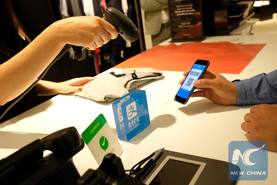 Photo provided by German department store retailer Breuninger shows a customer using Alibaba's Alipay at Breuninger store in Dusseldorf, Germany, June 29, 2018. (Breuninger/Handout via Xinhua)