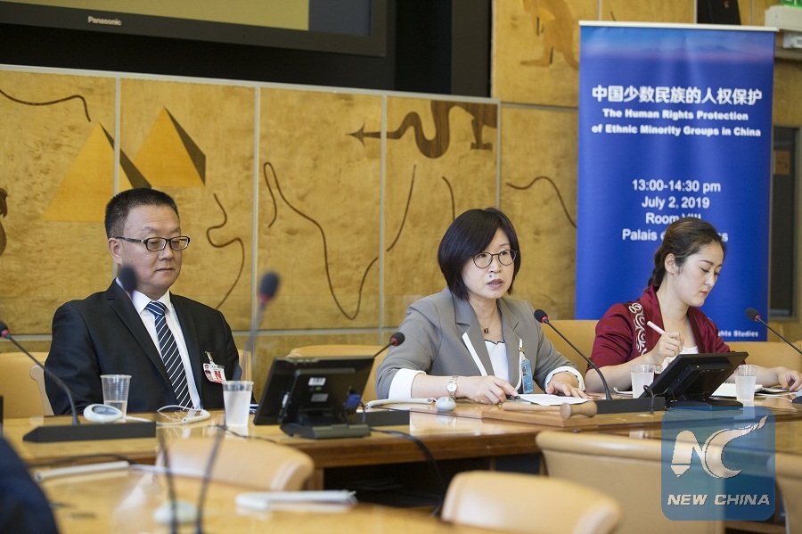 Experts attend a side-event on China's human rights protection of ethnic minorities amid the 41st session of the UN Human Rights Council in Geneva, Switzerland, July 2, 2019. (Xinhua/Xu Jinquan)
