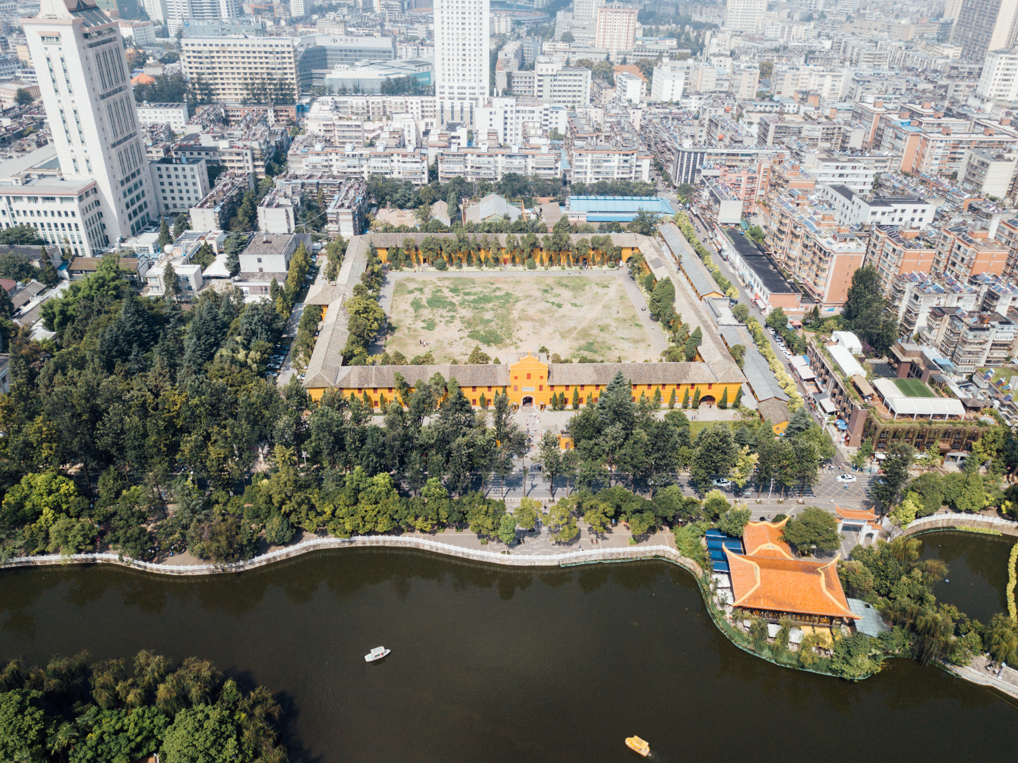 Aerial view of the Golden Horse and Jade Rooster Archways in downtown Kunming, Aug. 16, 2019. (Xinhua/Jiang Wenyao)