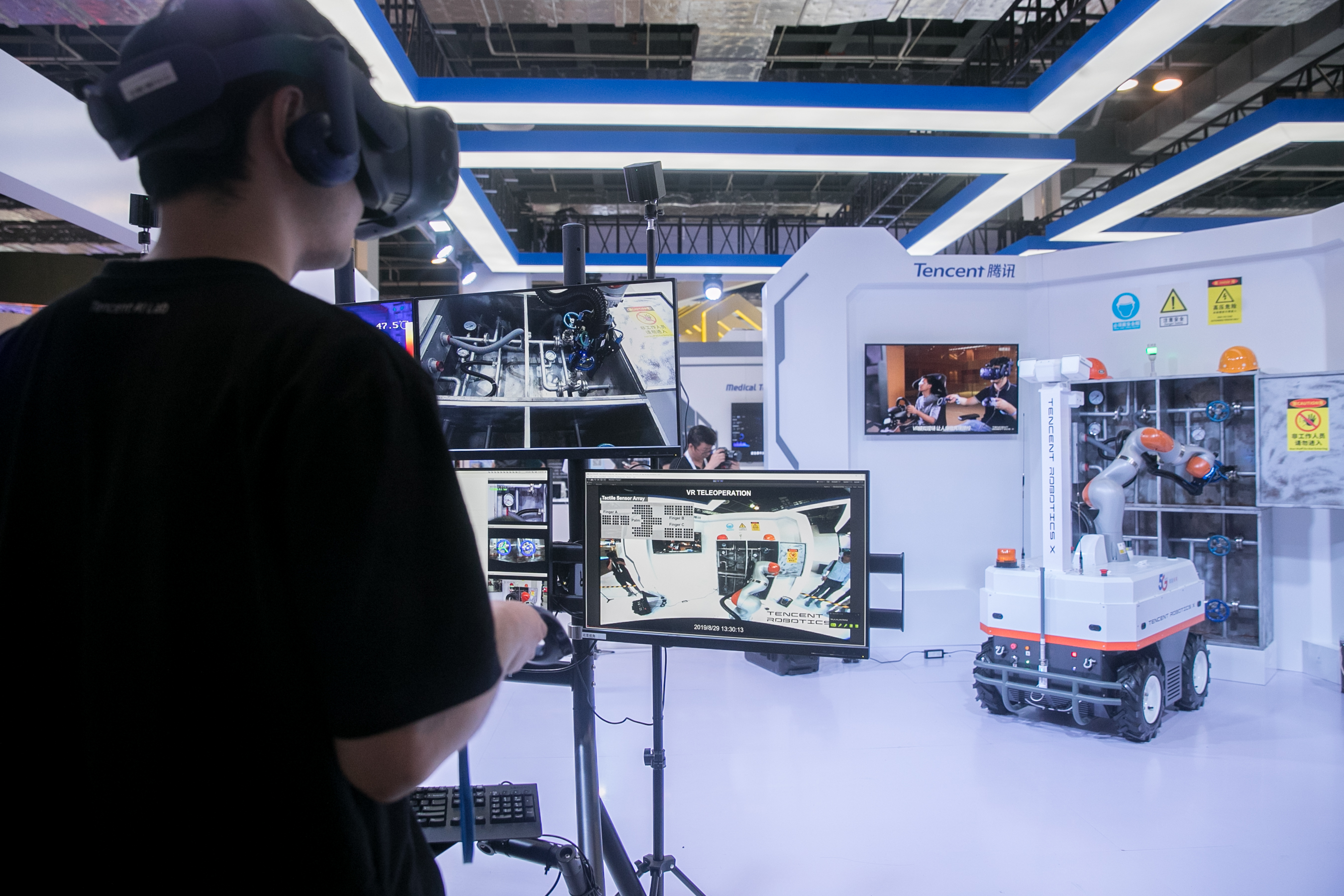 A staff member demonstrates 5G-based remote control of a robot during the 2019 World Artificial Intelligence Conference in Shanghai, Aug. 29, 2019. (Xinhua/Fang Zhe)