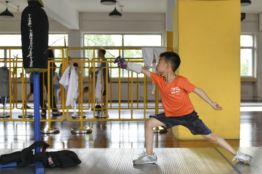 Zhang Yimeng attends his training session in a fencing club in Jinan, east China's Shandong Province, on July 16, 2019. Zhang Yimeng, an 8-year-old primary school pupil in Jinan, started to learn fencing in 2017. At the begining, he was attracted by the cool fencing equipment on the enrollment poster. After training for almost 2 years, he has become obsessed with fencing and has achieved good results in various levels of children's fencing games in the country. "We don't know how far he can go in fencing, but he becomes more self-reliant and confident, this is the benifits of sports." said his parents. Fencing is becoming popular in China. According to local organizations, there are 7 fencing clubs in Jinan with about 1,000 young fencers registered. (Xinhua/Zhu Zheng)