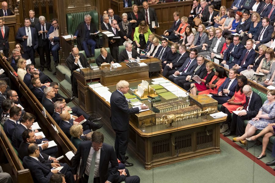 British Prime Minister Boris Johnson (C) speaks in the House of Commons in London, Britain, on Sept. 3, 2019. (Roger Harris/UK Parliament/Handout via Xinhua)