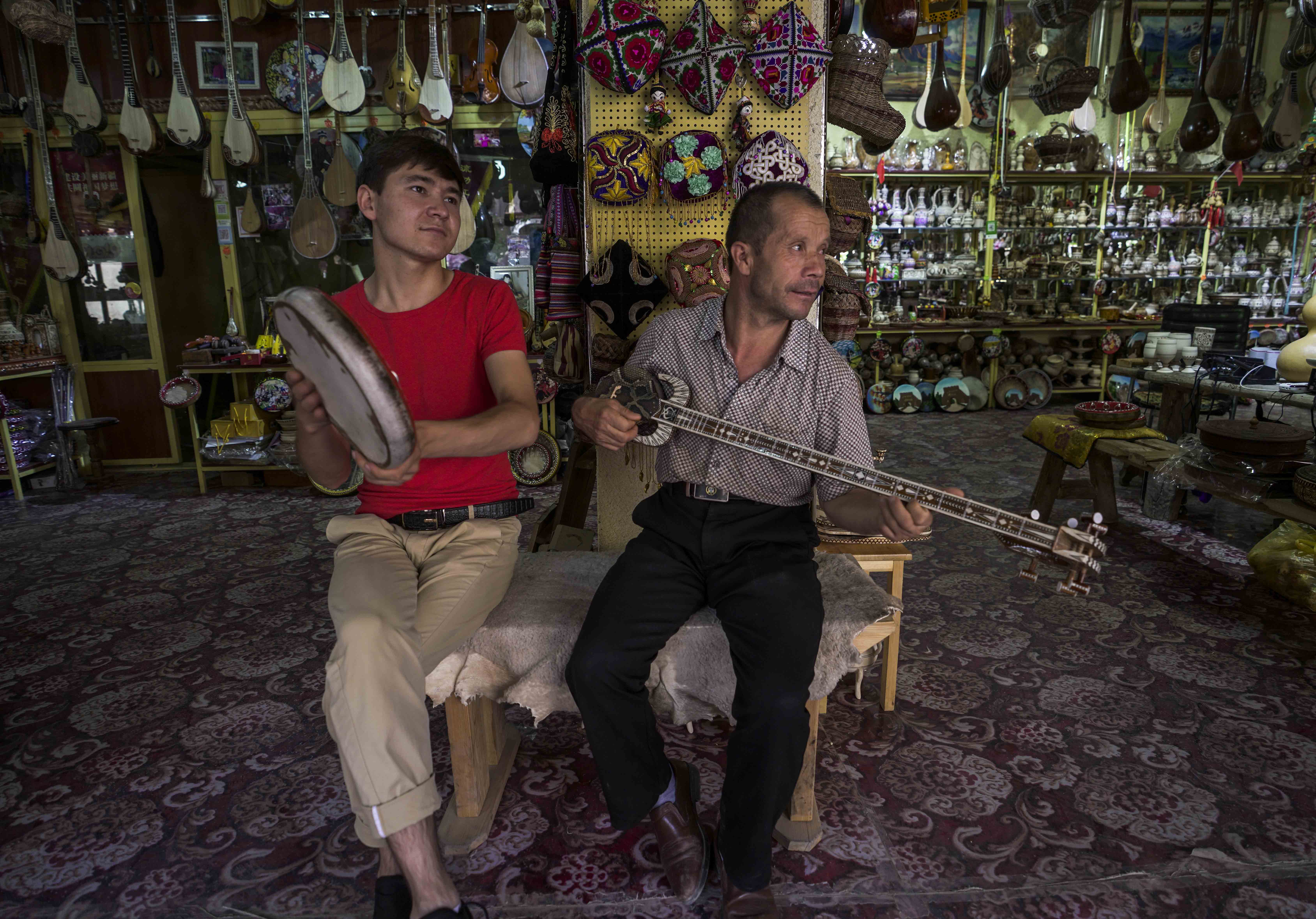 The owner of a wooden handicraft shop (L) and a staff member play musical instruments in the ancient city of Kashgar, northwest China's Xinjiang Uygur Autonomous Region, July 6, 2019. In the first half of 2019, the ancient city of Kashgar received over 310,000 tourists. (Xinhua/Zhao Ge)