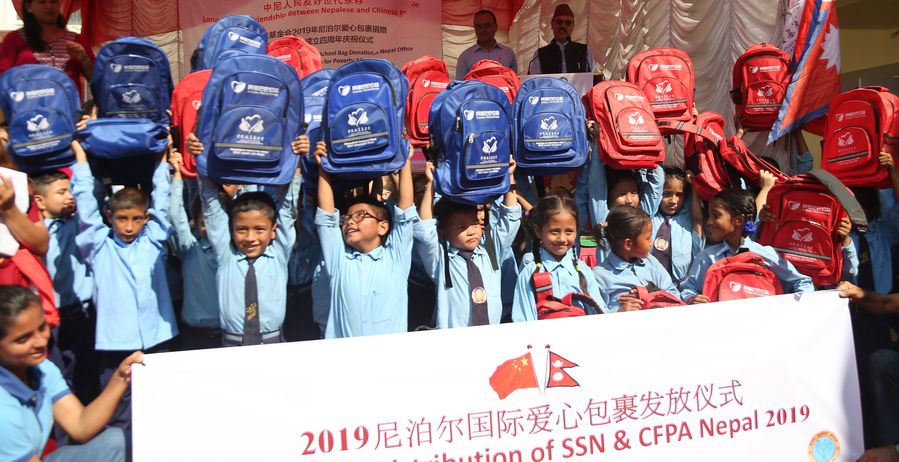 Students pose with bags distributed by China Foundation for Poverty Alleviation (CFPA) during a ceremony in Kathmandu, Nepal, on Aug. 27, 2019. (Xinhua)