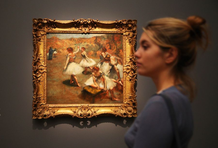 A visitor views a painting during the exhibition "Degas at the Opera" at the Orsay Museum in Paris, France, Sept. 24, 2019. (Xinhua/Gao Jing)