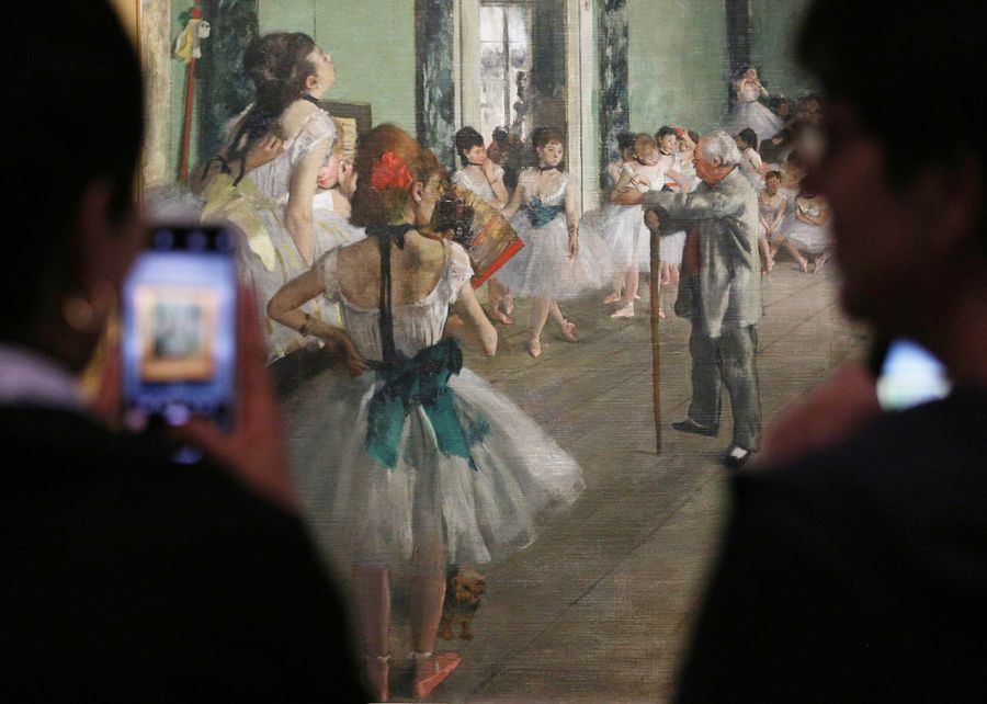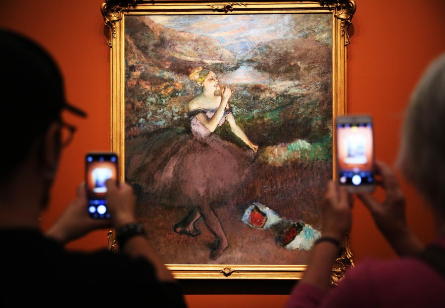 A visitor takes a photo of a painting during the exhibition "Degas at the Opera" at the Orsay Museum in Paris, France, Sept. 24, 2019.(Xinhua/Gao Jing)