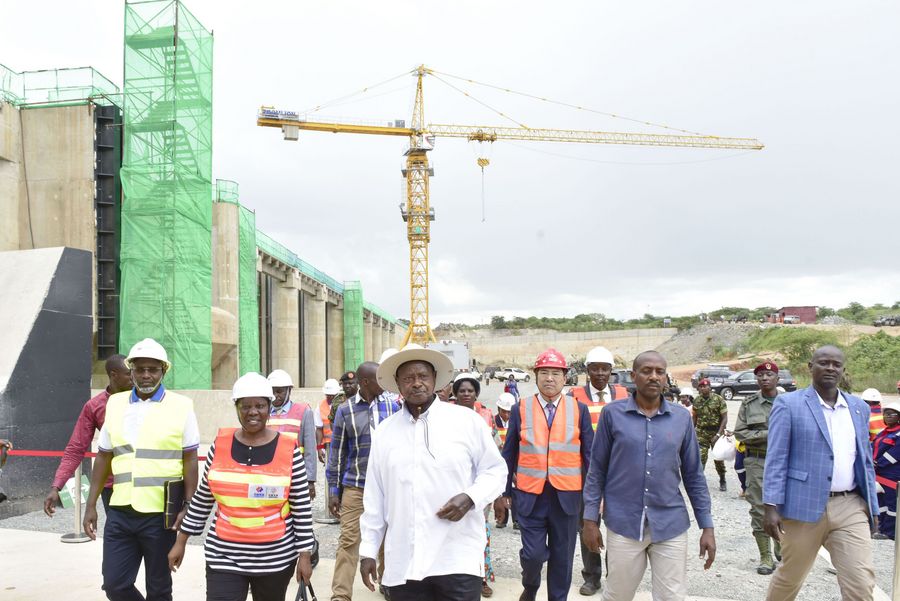 Ugandan President Yoweri Museveni (Front C) was inspecting the construction work of the country's largest hydropower plant, the Karuma Power Plant in the midwestern district of Kiryandongo on Aug. 23, 2018. Uganda contributed 15 percent of funding while the China Export and Import Bank provided up to 85 percent of financing for the project. The total cost is 1.4 billion dollars for the plant. (Xinhua)