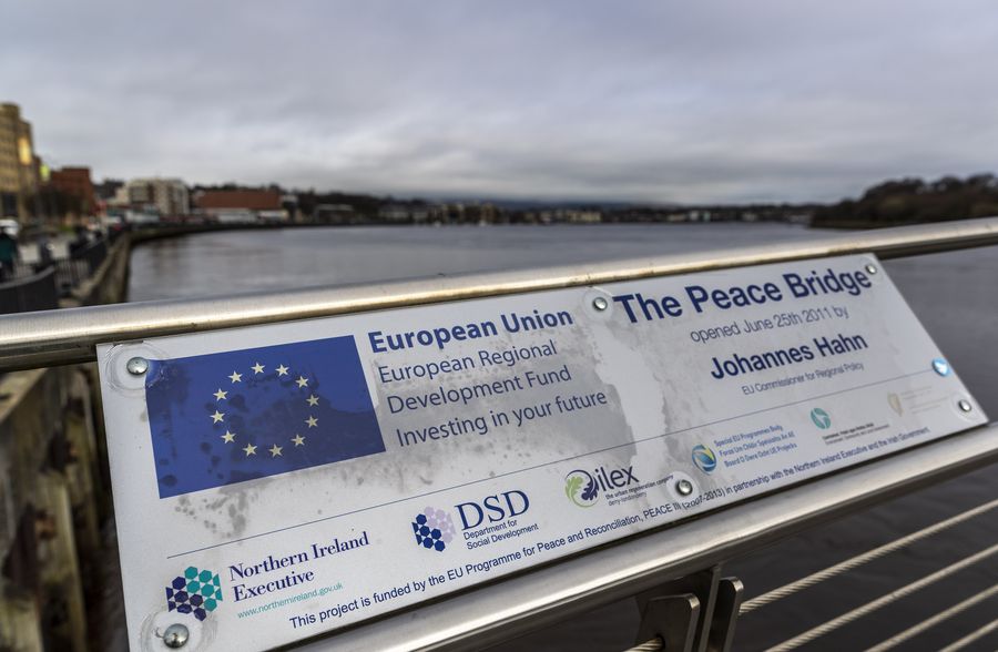 Photo taken on March 20, 2019 shows a plaque of the "Peace Bridge" in Derry, a border city in Northern Ireland, the United Kingdom.(Xinhua/Han Yan)