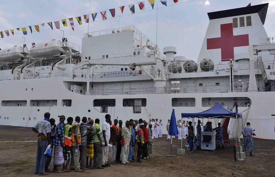 Doctors of Chinese hospital ship Peace Ark provide free medical services to local people in Doraleh, Djibouti, on Aug. 25, 2017. The Peace Ark arrived in Djibouti on Aug. 23 and was expected to carry out a nine-day medical service in Djibouti. (Xinhua/Wang Shoubao)