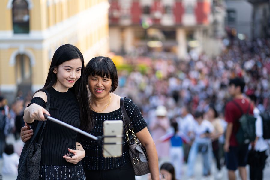 People take selfies in front of the Ruins of St. Paul's in Macao Special Administrative Region, south China, Oct. 2, 2019. (Xinhua/Cheong Kam Ka)