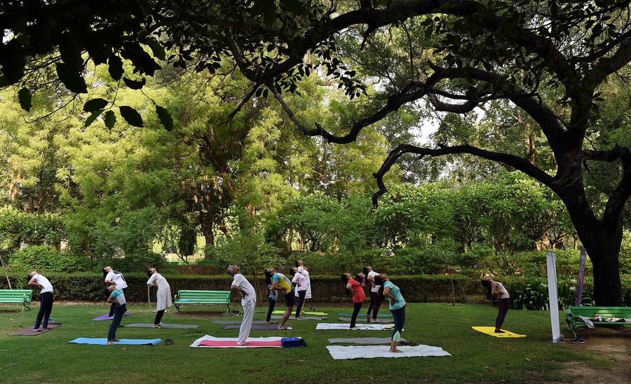 People practice yoga at a park in New Delhi, India, June 21, 2019. (Xinhua/Zhang Naijie)