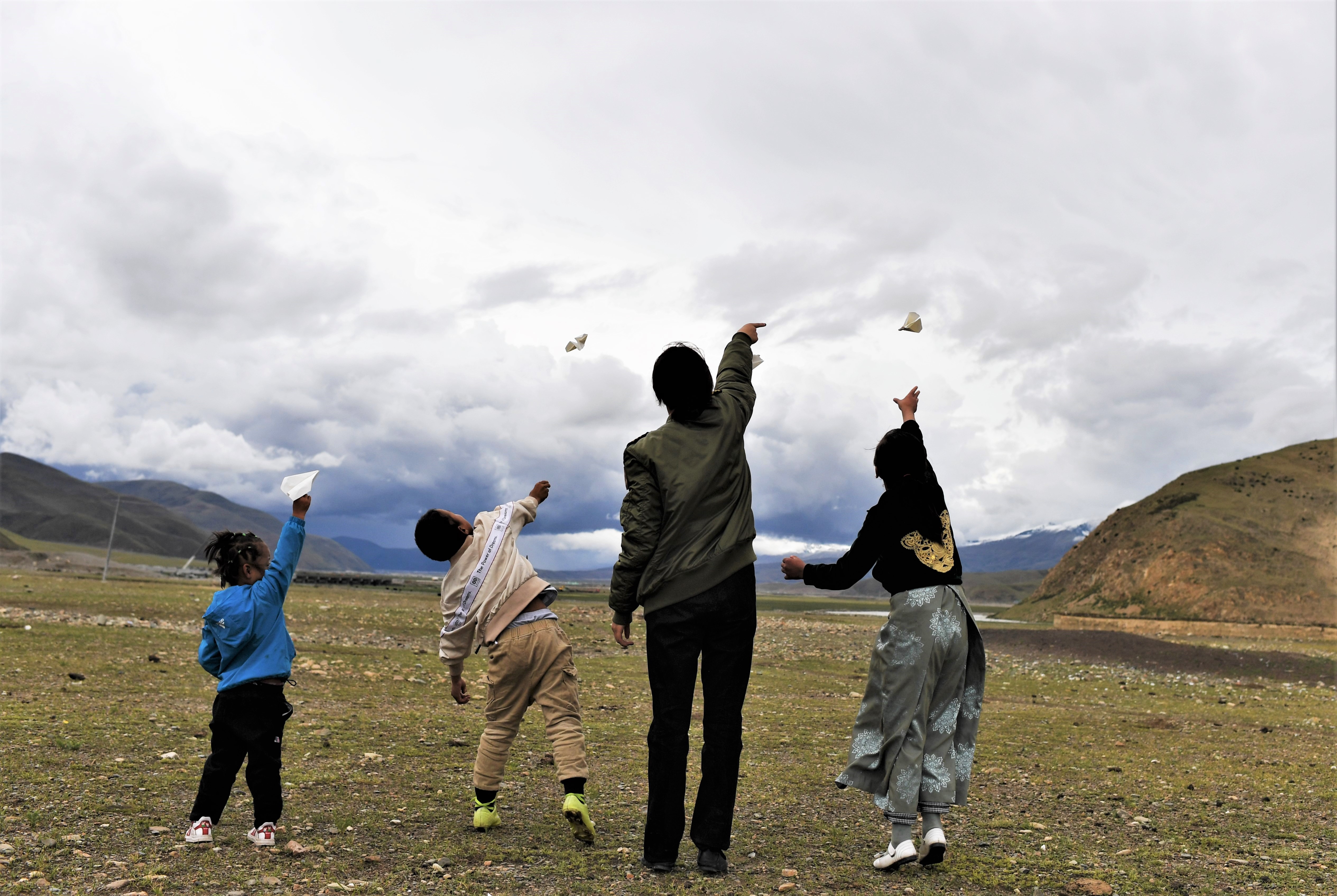 Jianre Yixi (2nd R) flies paper plane with siblings in southwest China's Tibet Autonomous Region, July 13, 2019. (Xinhua/Purbu Zhaxi)