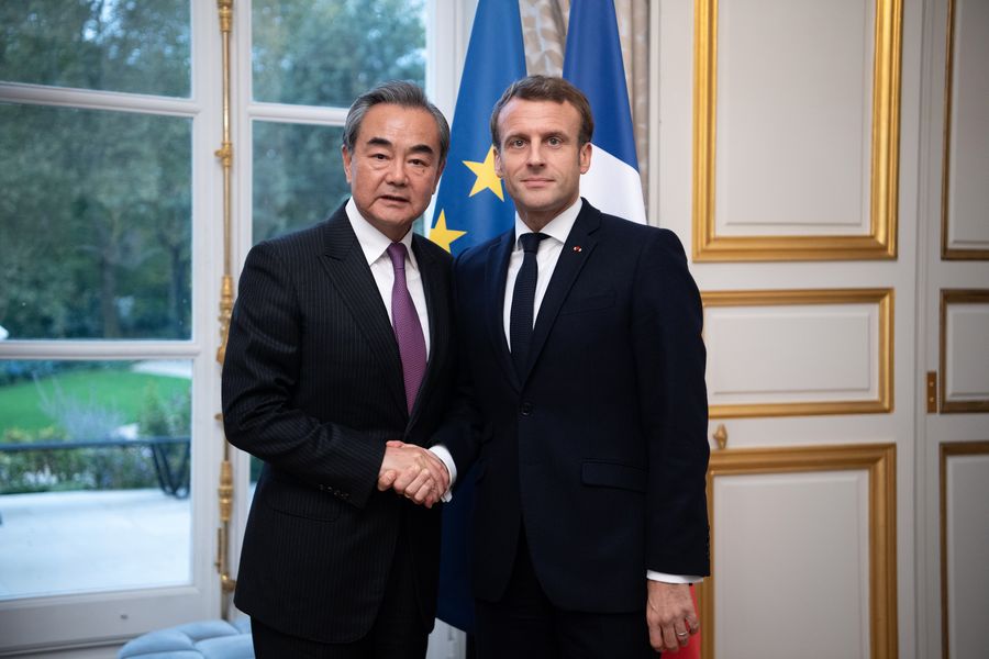 French President Emmanuel Macron meets with Chinese State Councilor and Foreign Minister Wang Yi at the Elysee Palace in Paris, France, Oct. 21, 2019. (Photo by Jack Chan/Xinhua)