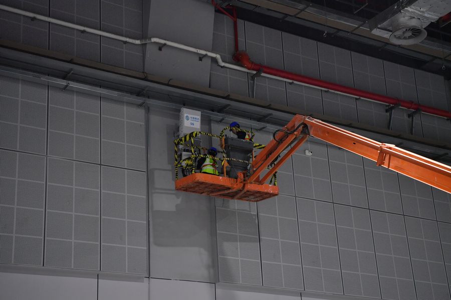 Engineers of China Mobile are working tirelessly to adjust the equipment at the National Exhibition and Convention Center (Shanghai) ahead of the second China International Import Expo (CIIE) in east China's Shanghai, Oct. 9, 2019. (Xinhua/He Xiyue)