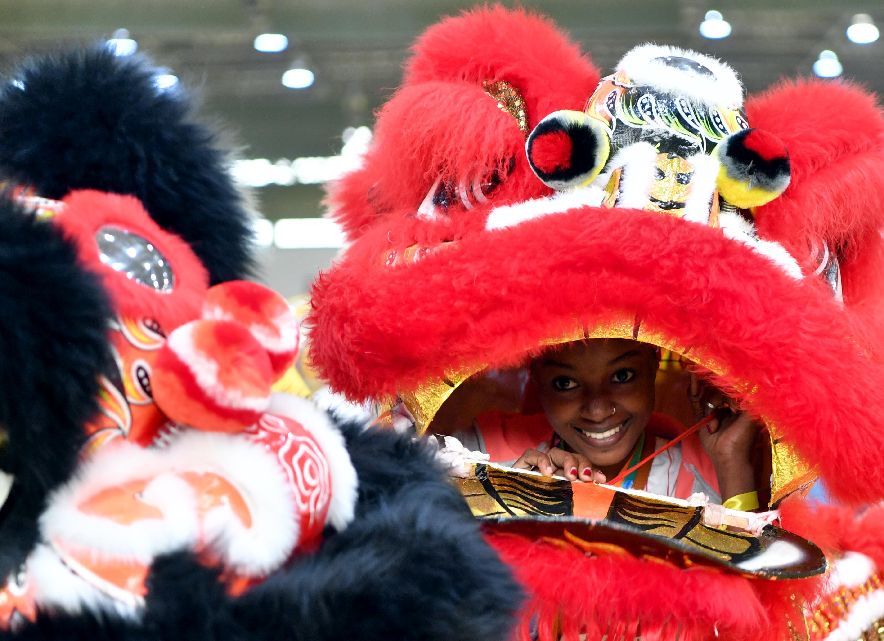 Raissa experiences lion dance at Sias University in Zhengzhou, central China's Henan Province, Oct. 28, 2019. Seventeen-year-old Raissa was born and bred in the Comoros, an island country in the Indian Ocean. In 2016, Raissa's grandmother was cured by doctors of the Chinese medical team in Africa. Raissa then developed a strong emotional connection with China, which prompted her to learn Chinese at the local Confucius Institute with unremitting endeavors. On the preliminary contest of the 12th Chinese Bridge proficiency competition for secondary school students in the Comoros this year, Raissa won the championship. Thus she got the chance to visit China for the first time as she came to Zhengzhou to attend the second-round competition. Sheerly fascinated by Chinese culture, Raissa has taken part in various activities on traditional Chinese medicine and folk arts during her stay in Zhengzhou. (Xinhua/Li Jianan)