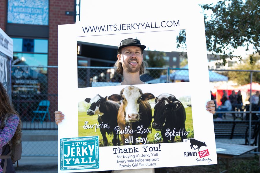 A man holds a banner to promote a plant-based jerky at Texas Veggie Fair in Dallas, Texas, the United States, Nov. 2, 2019. (Photo by Dan Tian/Xinhua)