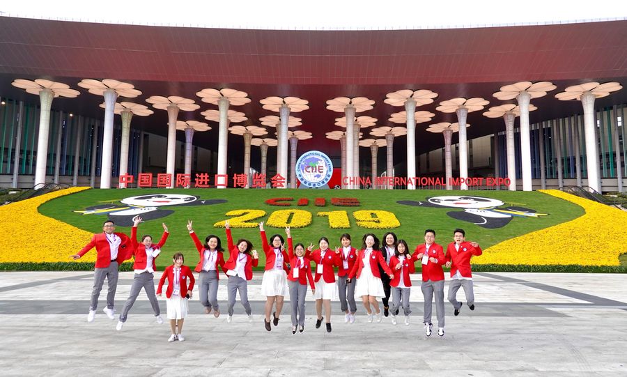 Volunteers pose for a photo at the south square of the National Exhibition and Convention Center, the main venue for the second China International Import Expo (CIIE), in Shanghai, east China, Nov. 4, 2019. (Xinhua/Cai Yang)