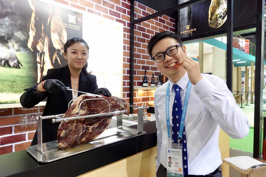 A visitor (R) tastes a slice of Spanish ham at the Food and Agricultural Products exhibition area during the second China International Import Expo (CIIE) in Shanghai, east China, Nov. 5, 2019. (Xinhua/Cai Yang)