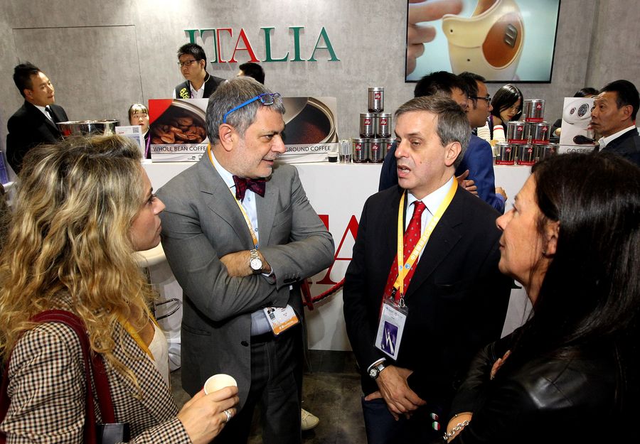 Visitors talk at the Italy pavilion during the second China International Import Expo (CIIE) in Shanghai, east China, Nov. 6, 2019. (Xinhua/Chen Fei)