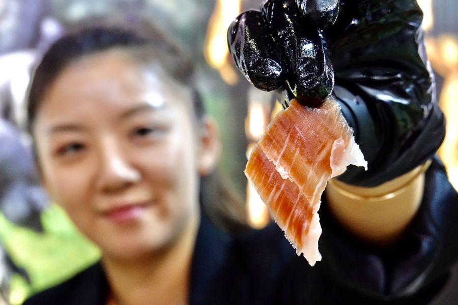 A staff member shows a slice of Spanish ham at the Food and Agricultural Products exhibition area during the second China International Import Expo (CIIE) in Shanghai, east China, Nov. 5, 2019. (Xinhua/Cai Yang)