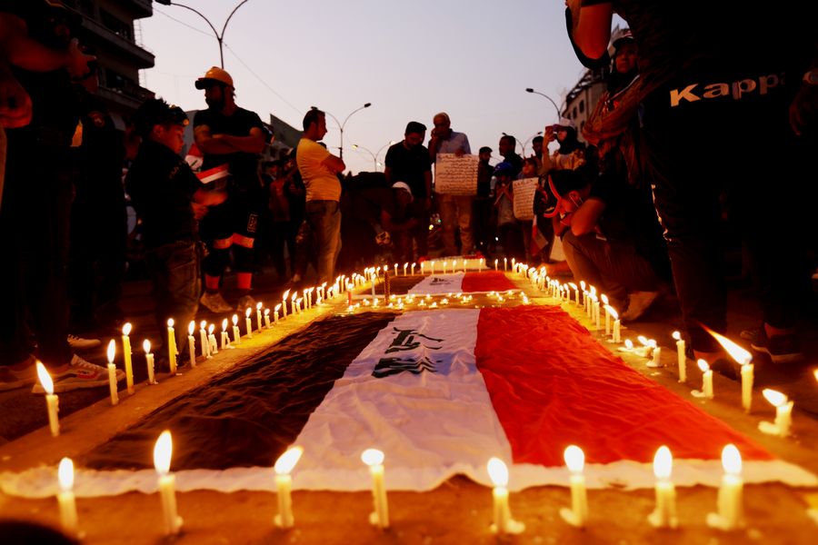 Protesters light candles during a demonstration at Tahrir square in Baghdad, Iraq, on Nov. 2, 2019. (Xinhua/Khalil Dawood)