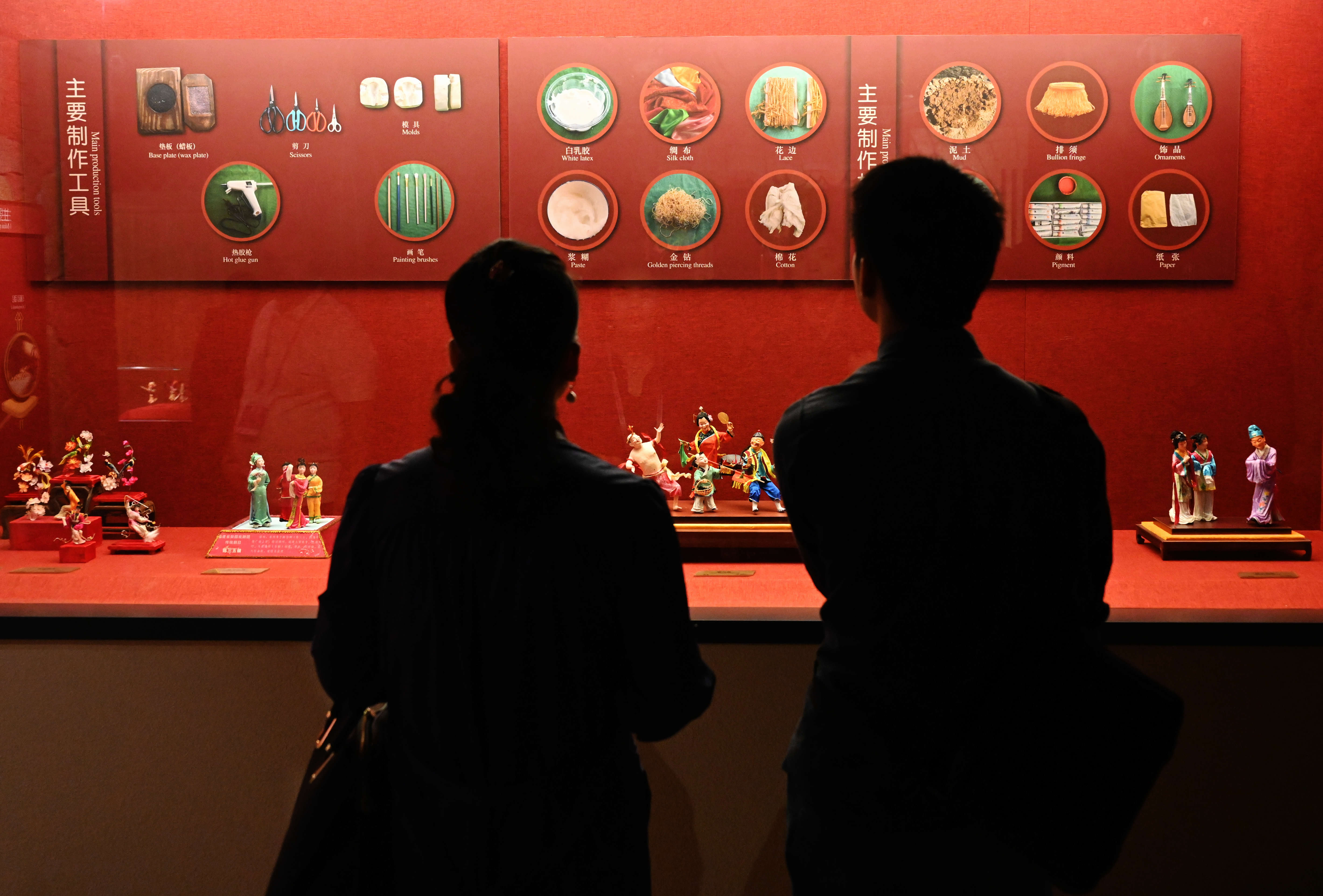 An artist manipulates a marionette in a performance for visitors during an exhibition on intangible cultural heritages along the ancient Maritime Silk Road in Quanzhou, southeast China's Fujian Province, Nov. 23, 2019. (Xinhua/Wei Peiquan)