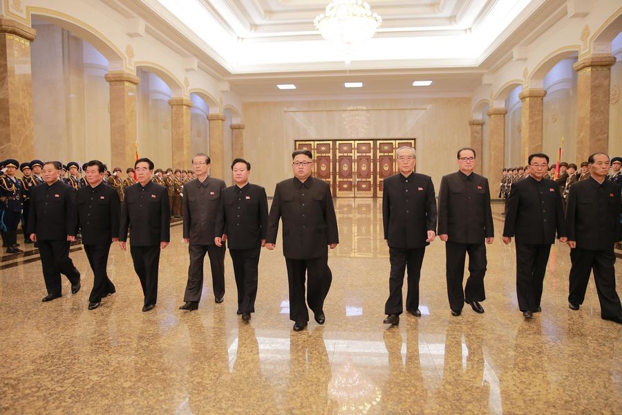 Photo provided by Korean Central News Agency (KCNA) on July 8, 2016 shows top leader of the Democratic People's Republic of Korea (DPRK) Kim Jong Un (C), with the vice-chairmen of the Central Committee of the Workers' Party of Korea (WPK) Choe Ryong Hae (5th L), Kim ki Nam (4th R), Ri Su Yong (3rd R) and other officials walking in the hall where the statues of late leader Kim Il Sung and Kim Jong Il stand. (Xinhua/KCNA)