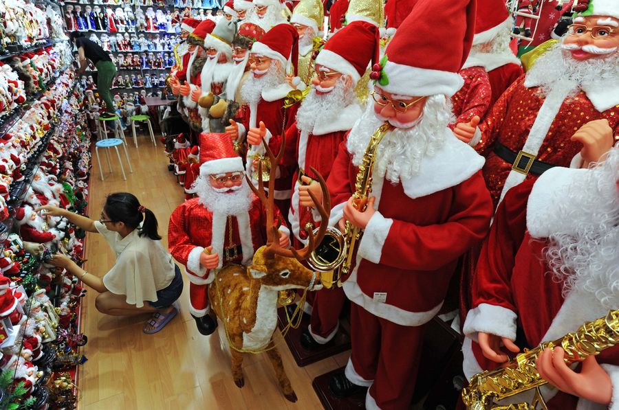 File photo of Xinhua shows a seller arranges Santa Claus dolls at the Yiwu International Trading Mall in Yiwu City, east China's Zhejiang Province. (Xinhua/Tan Jin)
