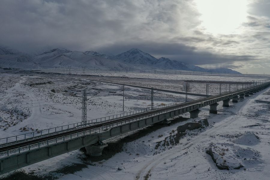 Aerial photo taken on Dec. 16, 2019 shows a railway bridge near the Da Qaidam Station along the Dunhuang-Golmud railway in northwest China's Qinghai Province. A new railway linking Dunhuang city, northwest China's Gansu Province, and Golmud city, northwest China's Qinghai Province, fully opened on Wednesday. (Xinhua/Zhang Long)
