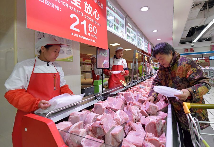 Customers purchase reserve pork in a supermarket in Nanchang, east China's Jiangxi Province, Dec. 22, 2019. (Xinhua/Peng Zhaozhi)