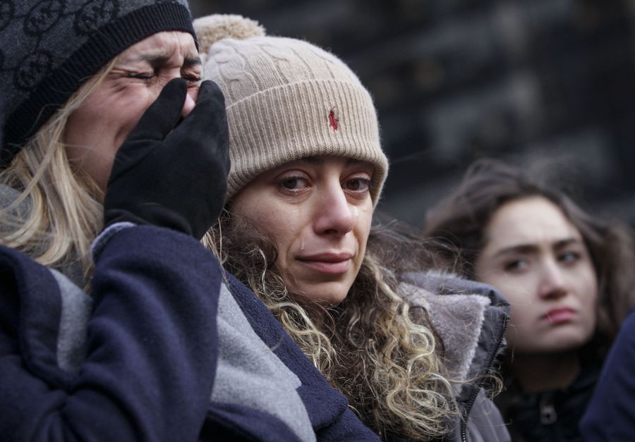 A woman sheds tears at a vigil outside Vancouver Art Gallery for victims of the Ukrainian passenger plane crash in Vancouver, Canada, Jan. 11, 2020. (Photo by Liang Sen/Xinhua)