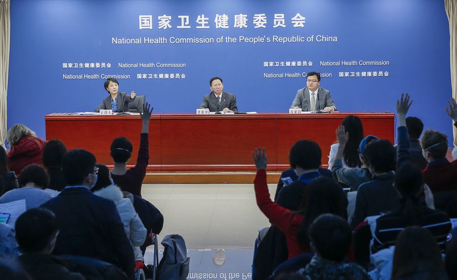 Photo taken on Jan. 27, 2020 shows a press conference held by the National Health Commission in Beijing, capital of China. The seven-day Spring Festival vacation, scheduled to end on Jan. 30, was extended to Feb. 2. Universities, primary and middle schools and kindergartens across the country will postpone the opening of the spring semester until further notice, according to the General Office of the State Council.
