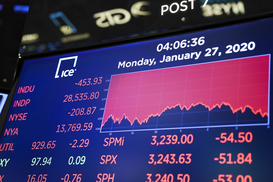 An electronic screen shows the trading data at the New York Stock Exchange in New York, the United States, on Jan. 27, 2020. U.S. stocks ended significantly lower on Monday. The Dow fell 1.57 percent to 28,535.80, the S&P 500 decreased 1.57 percent to 3,243.63, and the Nasdaq dropped 1.89 percent to 9,139.31. (Xinhua/Wang Ying)