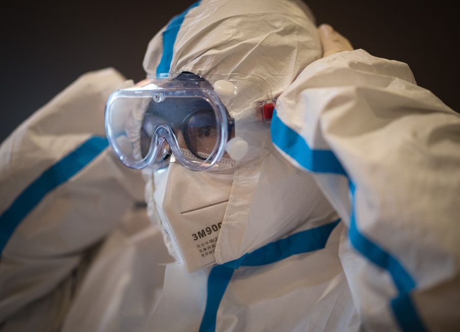 A member of the medical team of the Second Military Medical University puts on protective clothing at Hankou Hospital in Wuhan, central China's Hubei Province, Jan. 27, 2020. (Xinhua/Xiao Yijiu)