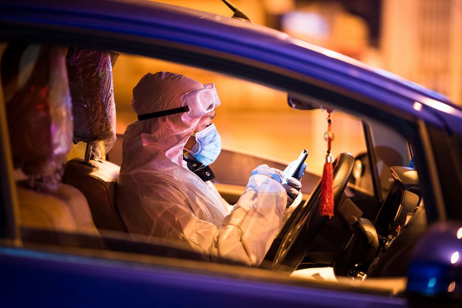 Volunteer Wang Zhen, member of the volunteer group "Wuhan Emergency Team" taking pregnant women without access to vehicles to the hospital, checks information in a car in Wuhan, central China's Hubei Province, Feb. 29, 2020. (Xinhua/Xiao Yijiu)