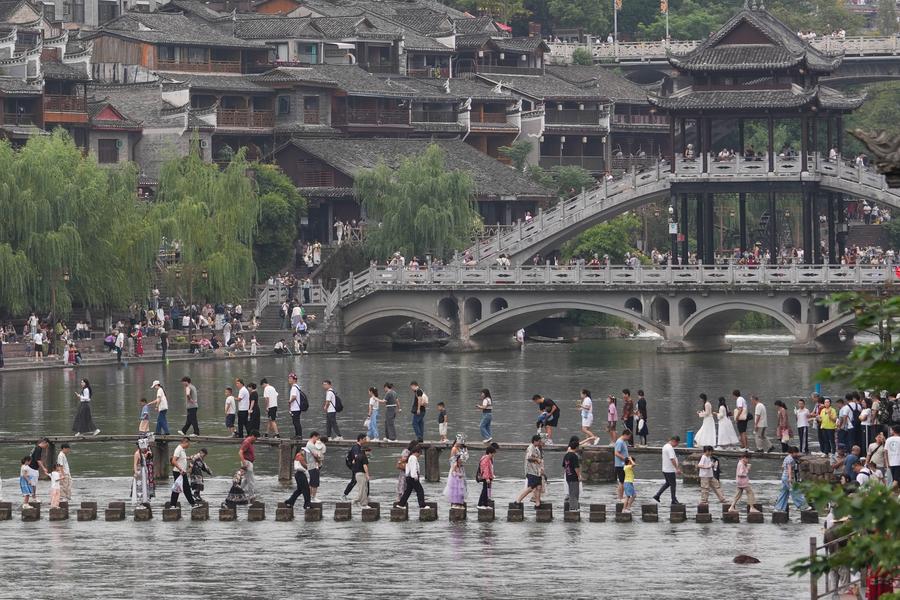 Tourists visit a scenic area in Fenghuang County, central China's Hunan Province, Oct. 5, 2025. (Xinhua/Chen Sihan)
