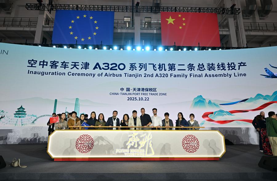 Guests pose for a group photo at the inauguration ceremony of Airbus' second Final Assembly Line (FAL) for A320 family aircraft in Tianjin, north China, Oct. 22, 2025. (Xinhua/Sun Fanyue)