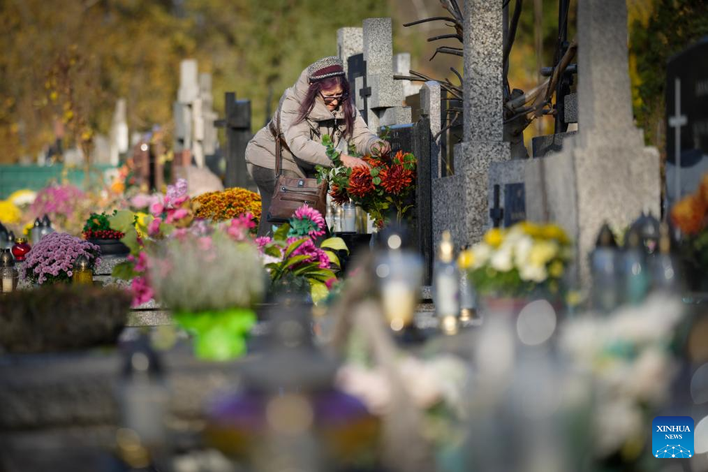 A woman arranges flowers on a grave to commemorate All Saints' Day at a cemetery in Warsaw, Poland on Nov. 1, 2025. Saturday marks All Saints' Day in Poland, when people traditionally return home to reunite with family members and visit cemeteries to honor their ancestors. (Photo by Jaap Arriens/Xinhua)