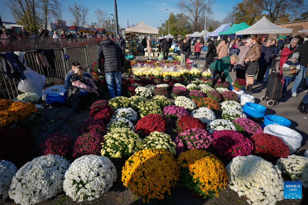 People buy flowers before visiting a cemetery to commemorate All Saints' Day in Warsaw, Poland on Nov. 1, 2025. Saturday marks All Saints' Day in Poland, when people traditionally return home to reunite with family members and visit cemeteries to honor their ancestors. (Photo by Jaap Arriens/Xinhua)