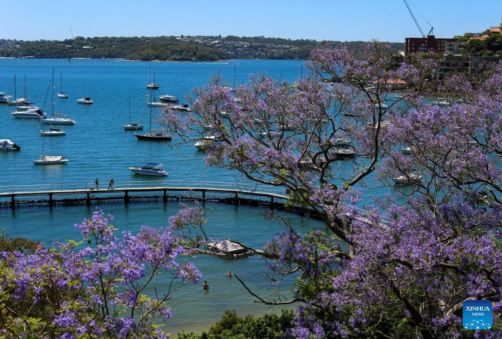 This photo taken on Nov. 5, 2025 shows the scenery of blooming jacaranda and Harbor Bridge in Sydney, Australia. (Xinhua/Ma Ping)
