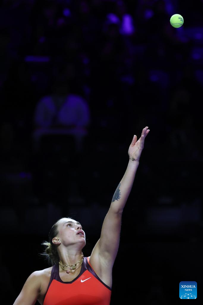 Aryna Sabalenka of Belarus serves during the round robin match against Jessica Pegula of the United States at WTA Finals tennis tournament in Riyadh, Saudi Arabia, on Nov. 4, 2025. (Xinhua/Luo Chen)