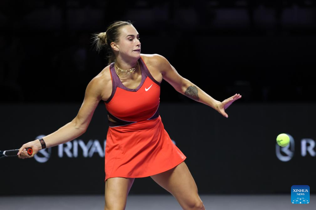 Aryna Sabalenka of Belarus returns a ball during the round robin match against Jessica Pegula of the United States at WTA Finals tennis tournament in Riyadh, Saudi Arabia, on Nov. 4, 2025. (Xinhua/Luo Chen)