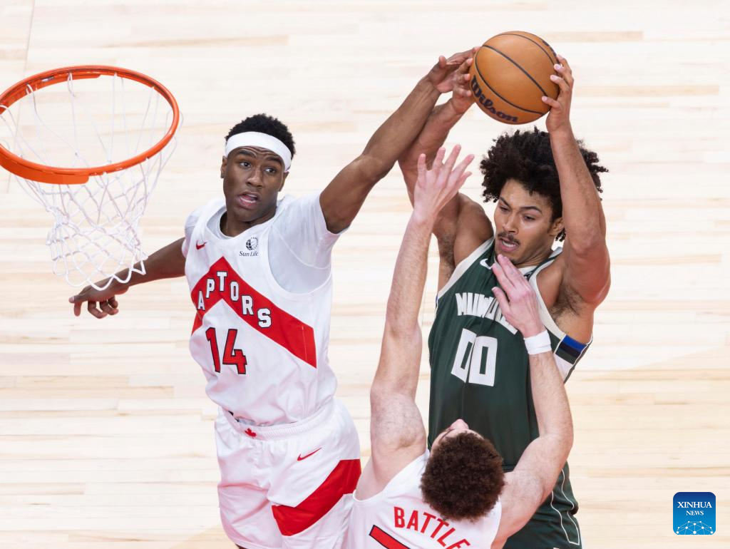Ja'Kobe Walter (L) of Toronto Raptors fights for a rebound with Jericho Sims of Milwaukee Bucks during the 2025-2026 NBA regular season match between Toronto Raptors and Milwaukee Bucks in Toronto, Canada, on Nov. 4, 2025. (Photo by Zou Zheng/Xinhua)