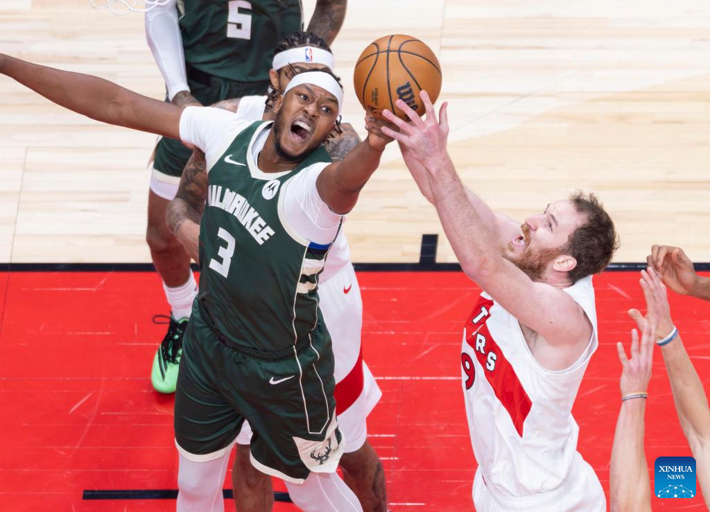 Giannis Antetokounmpo (R) of Milwaukee Bucks goes for a layup during the 2025-2026 NBA regular season match between Toronto Raptors and Milwaukee Bucks in Toronto, Canada, on Nov. 4, 2025. (Photo by Zou Zheng/Xinhua)