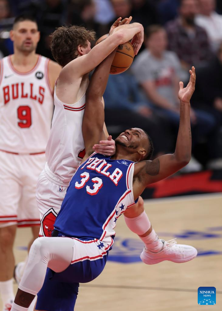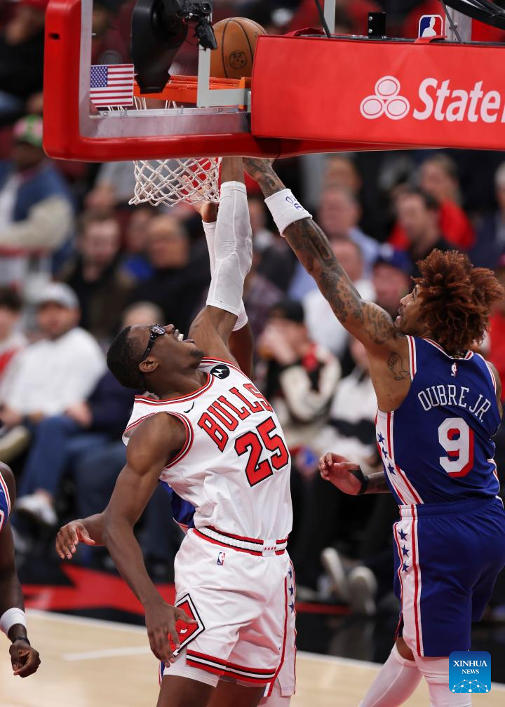 Philadelphia 76ers' Quentin Grimes (R) drives to the basket during the 2025-2026 NBA regular season match between Chicago Bulls and Philadelphia 76ers in Chicago, the United States, on Nov. 4, 2025. (Photo by Joel Lerner/Xinhua)