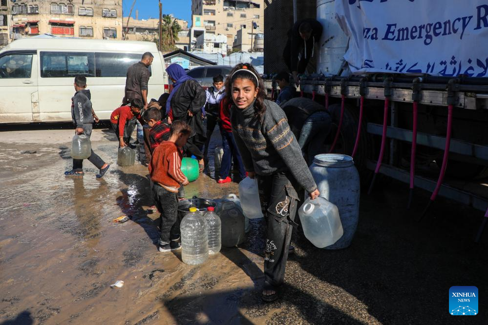 Palestinian children fetch water from a truck in Gaza City, Dec. 18, 2025. (Photo by Rizek Abdeljawad/Xinhua)